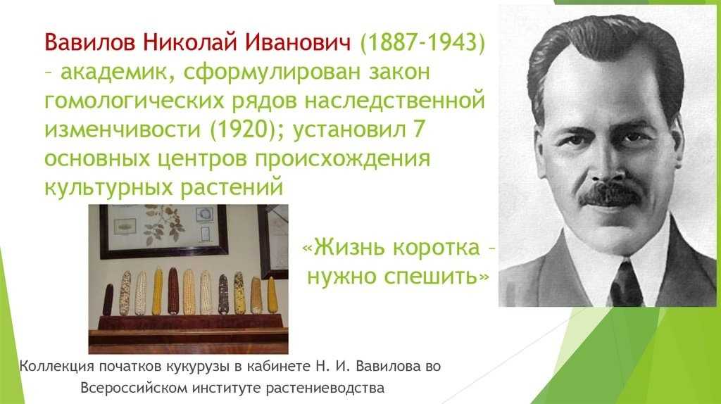 История генетики неразрывно связана с именем русского и советского ученого Н. Вавилова. Кроме генетики, он обладал академическими знаниями по химии, географии, ботанике. Имел звания Академика АН Советского Союза, президента и вице-президента ВАСХНИЛ, члена экспедиционной комиссии и Наркомзема СССР.