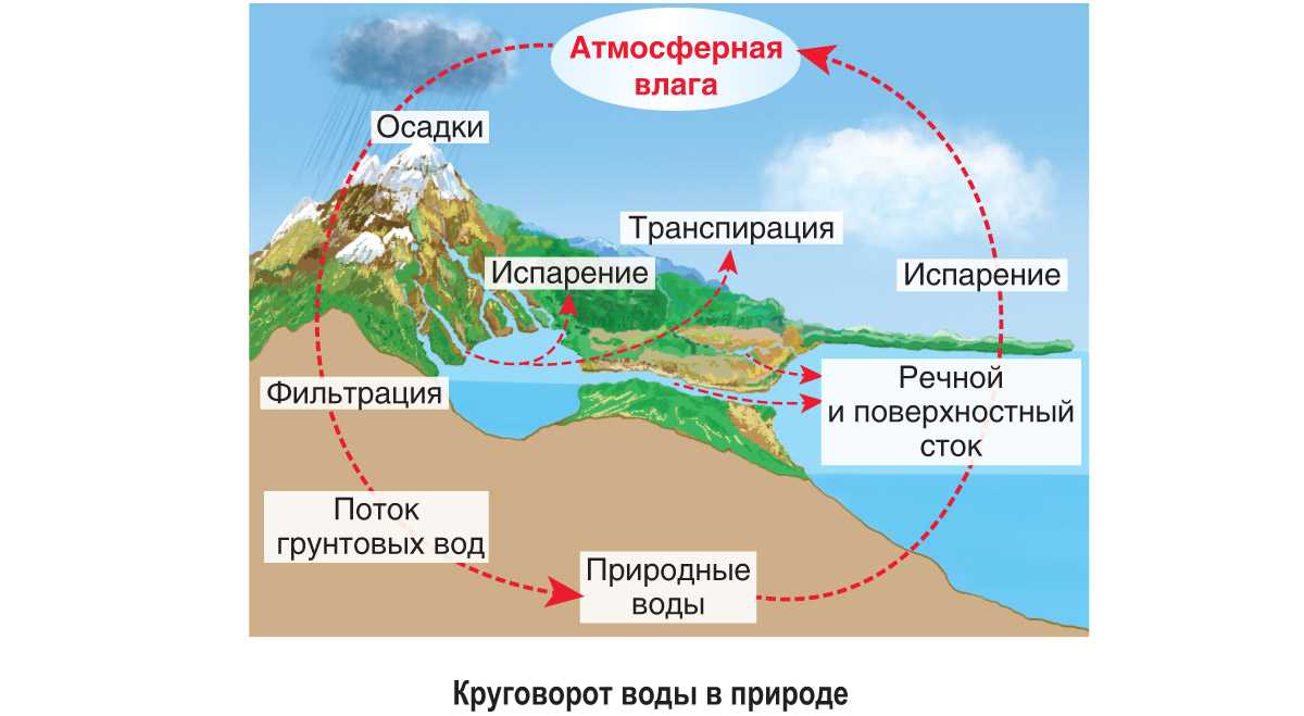 В круговороте воды важную роль играют живые организмы. Растения извлекают воду из почвы и испаряют ее в атмосферу. Масса испаряемой при этом воды может быть весьма значительна. Так, с 1 га леса испаряется 20—50 т воды в сутки.