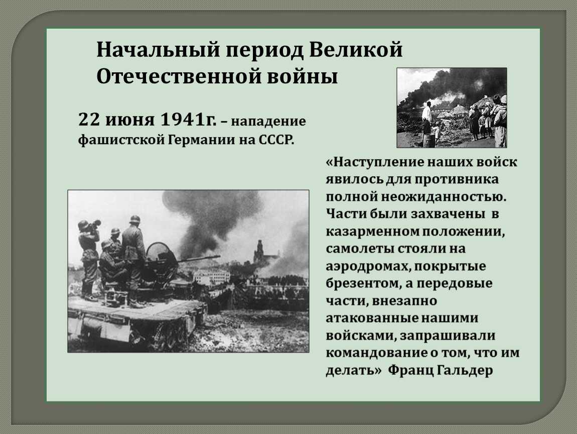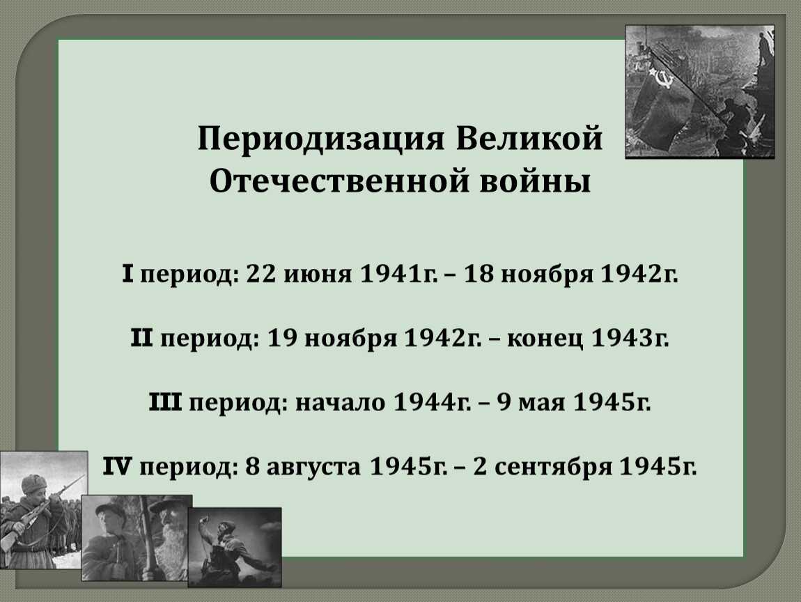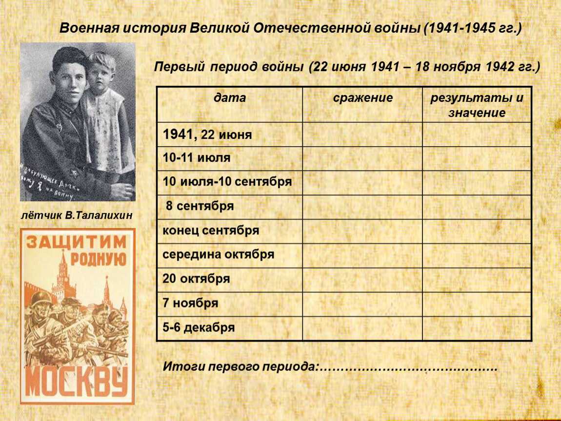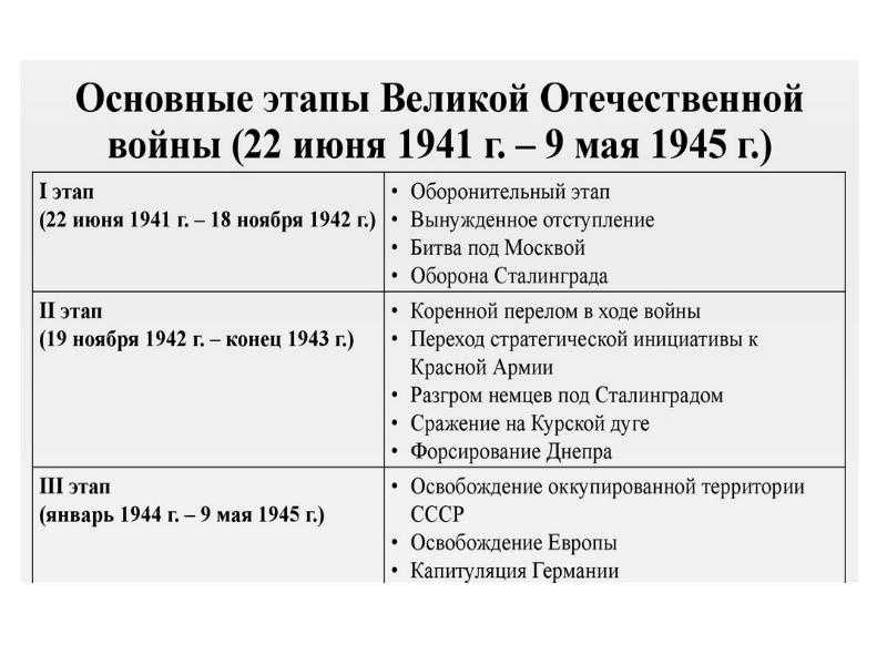 Главные итоги каждого периода приведены в таблице этапов Великой Отечественной войны: