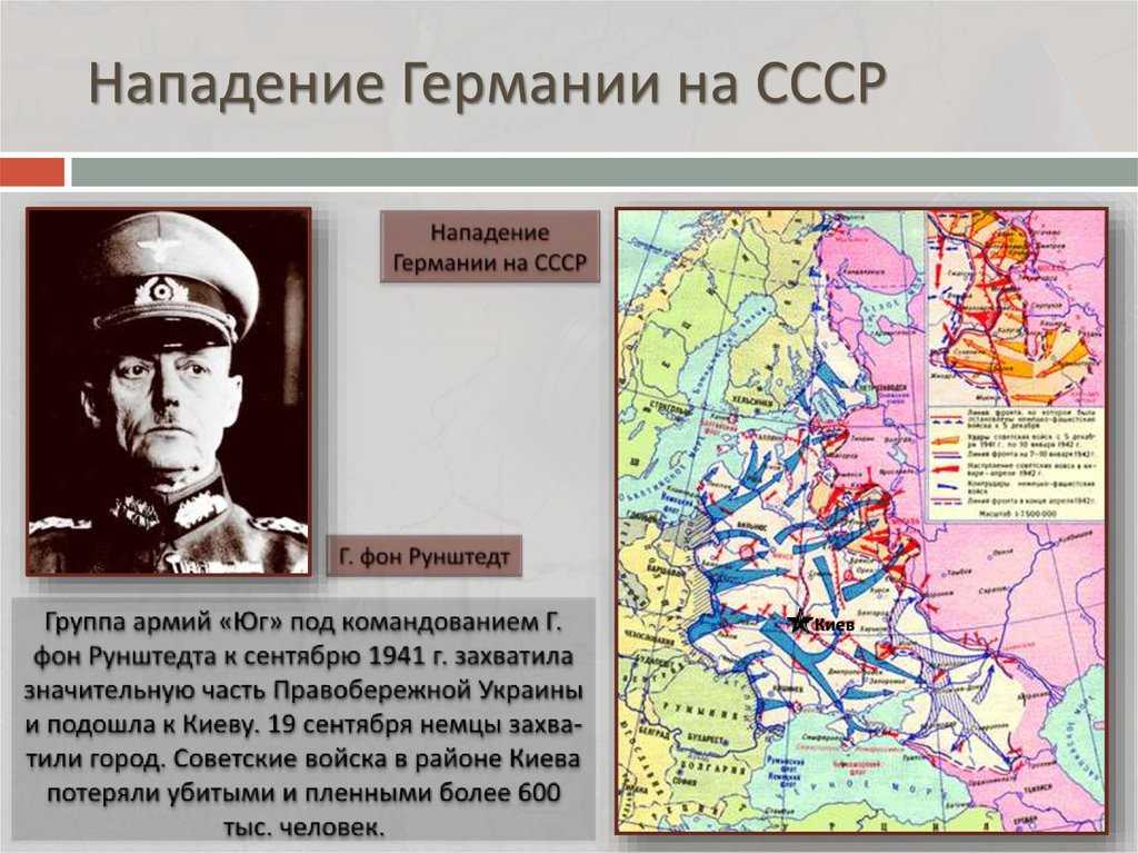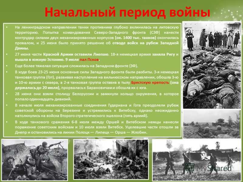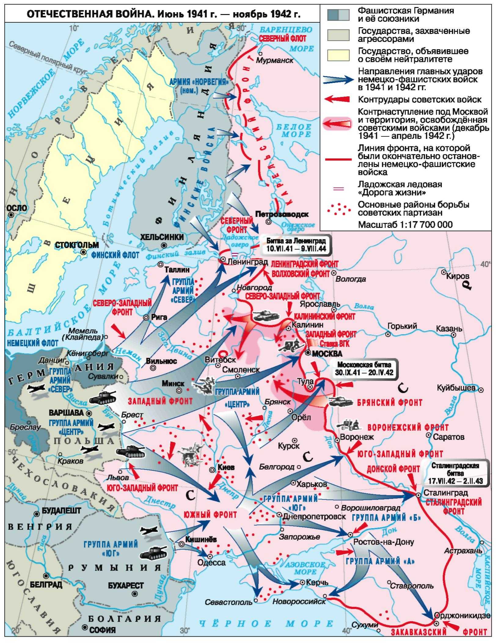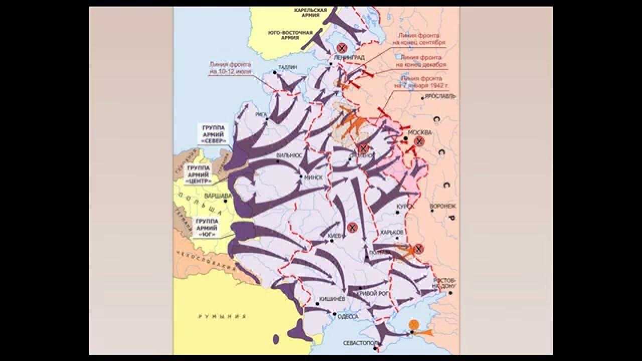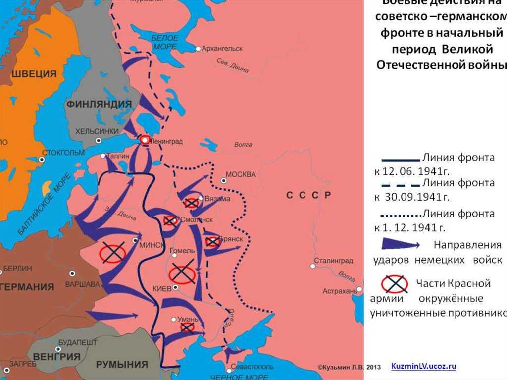 Прорыв немецких войск через советскую границу. Захват Германией Прибалтики, Белоруссии, большей части Украины, юга России. Блокада Ленинграда. Поражение немцев под Москвой |