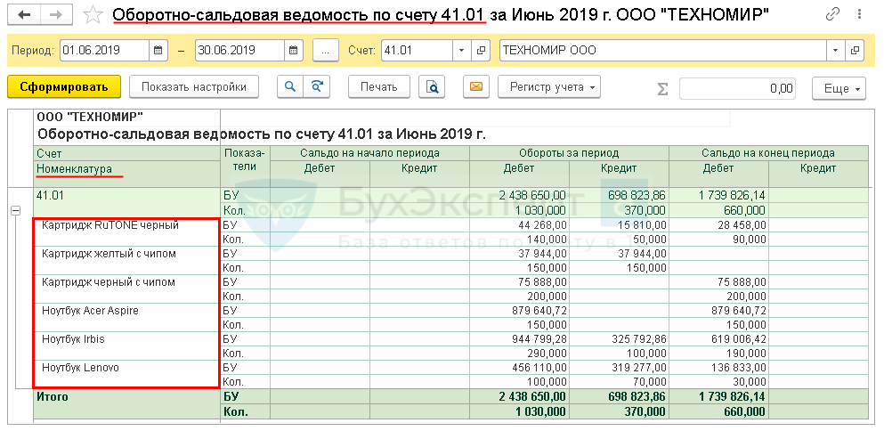 Типовые бухгалтерские отчеты позволяют просматривать аналитику указанных счетов в разрезе номенклатуры.