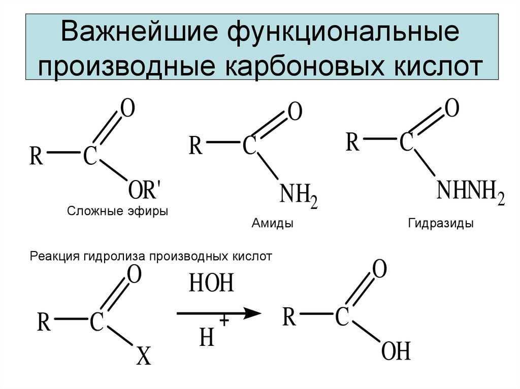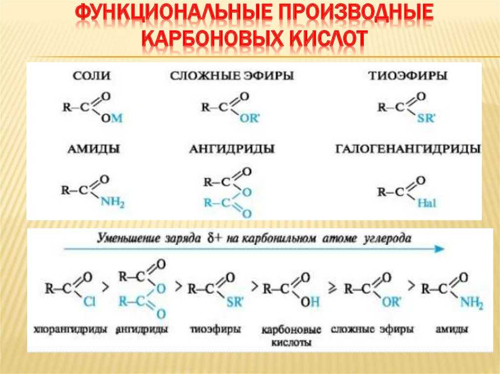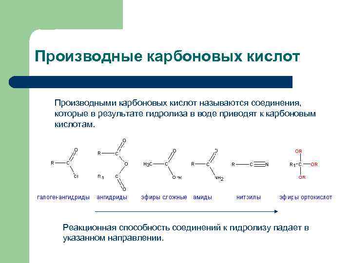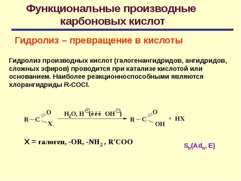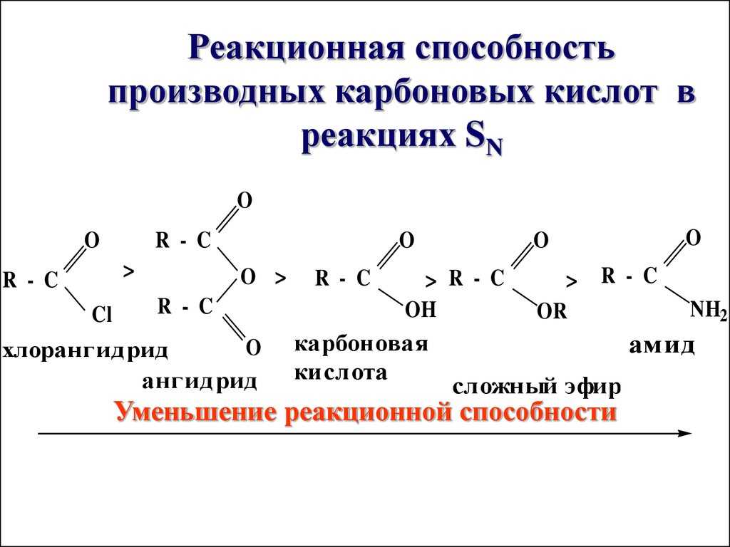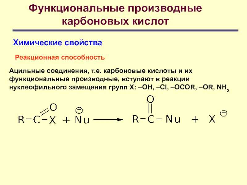 | Для карбоновых кислот характерны реакции нуклеофильного замещения группы ОН с образованием функциональных производных карбоновых кислот: сложных эфиров, амидов, ангидридов и галогенангидридов. |