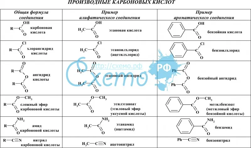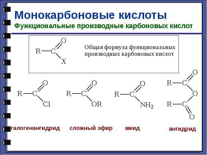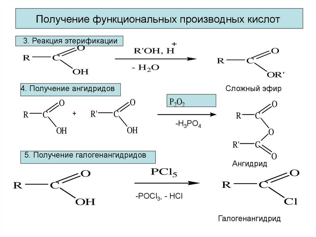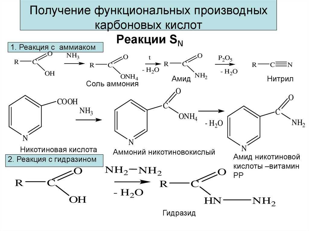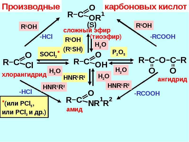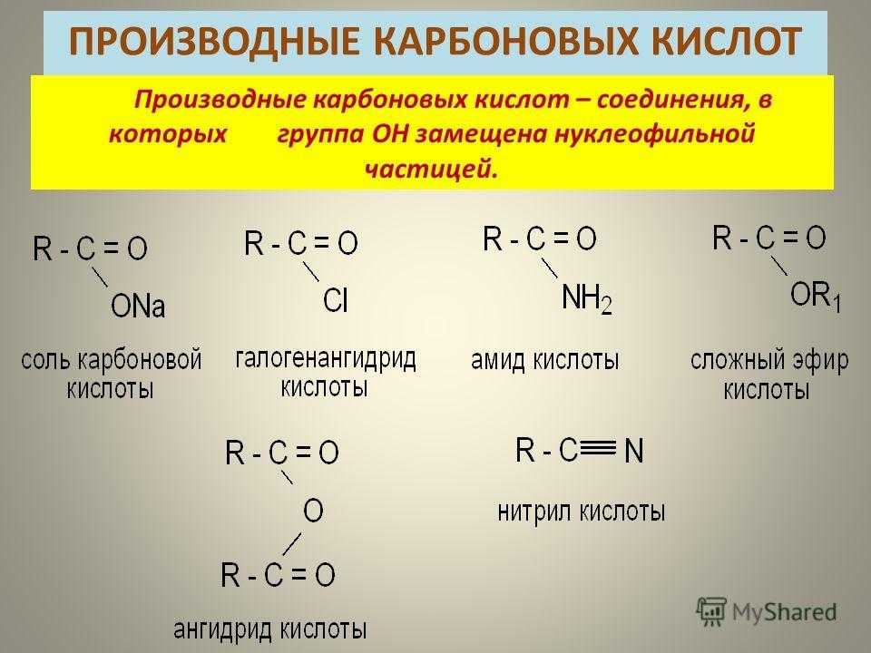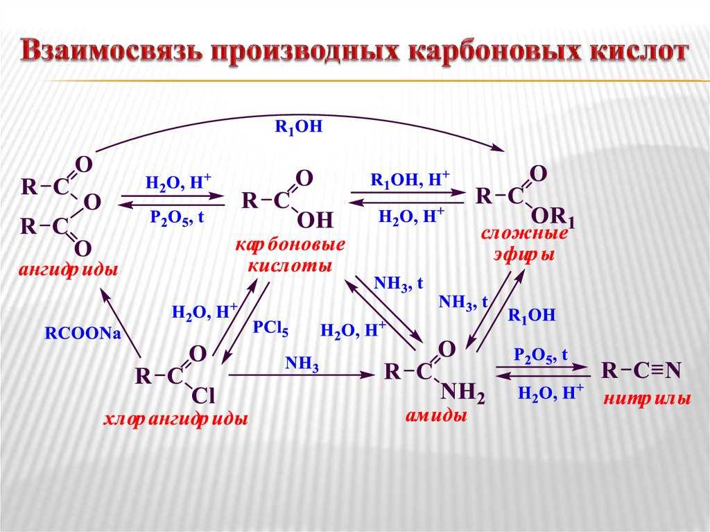 | Для карбоновых кислот характерны реакции нуклеофильного замещения группы ОН с образованием функциональных производных карбоновых кислот: сложных эфиров, амидов, ангидридов и галогенангидридов. |