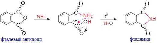 Циклические ангидриды реагируют с аммиаком и первичными аминами с образованием неполных амидов дикарбоновых кислот, которые при нагревании циклизуются в имиды: