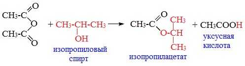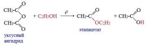взаимодействие ангидридов или галогенангидридов карбоновых кислот со спиртами (например, получение этилацетата из уксусного ангидрида и этилового спирта):