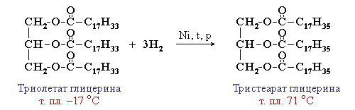 Жидкие жиры превращаются в твердые путем реакции гидрогенизации (гидрирования). При этом водород присоединяется по двойной связи, содержащейся в углеводородном радикале молекул масел.