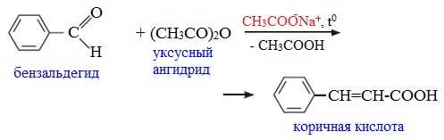 Как и в случае карбоновых кислот, в молекулах ангидридов атомы водорода при α-углеродных атомах подвижны. С участием связи С-Н в α-положении ангидриды карбоновых кислот в присутствии оснований (соли карбоновых кислот, третичные амины) вступают в реакцию конденсации с ароматическими альдегидами, образуя ненасыщенные аренкарбоновые кислоты.