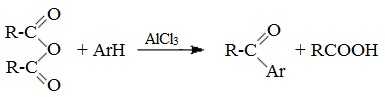 При взаимодействии ангидридов с аренами в присутствии хлорида алюминия образуются кетоны (реакция Фриделя-Крафтса):