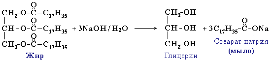 Для жиров, как сложных эфиров, характерна обратимая реакция гидролиза (катализатор – минеральные кислоты). В присутствии щелочей (или карбонатов натрия или калия) гидролиз жиров протекает необратимо. Продуктами в этом случае являются мыла – соли высших карбоновых кислот и щелочных металлов: