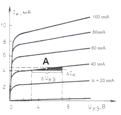 В случае переменного тока нужно смотреть на дифференциальное сопротивление. Если простыми словами: насколько сильно меняется ток при изменении напряжения. В приведённом примере, если напряжение на коллекторе меняется от 3 до 7 вольт при фиксированном токе базы, это довольно слабо влияет на ток коллектора, он меняется всего на 0.1 мА. Это соответствует сопротивлению (7-3)/0.1 = 40 кОм. Как видите, сопротивления постоянному и переменному току значительно отличаются.