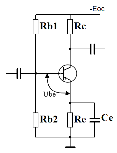 Схема с автоматическим смещением, получившая наибольшее распространение, содержит три резистора: Rb1, Rb2 и RE. За счёт отрицательной обратной связи создаваемой RE в цепи эмиттера, достигается требуемая стабилизация рабочей точки. Блокировочный конденсатор CE используется для устранения нежелательной обратной связи по переменному току. Схема эффективна как для германиевых, так и для кремниевых транзисторов. Для определения величин Rb1, Rb2 и RE должны быть известны напряжение источника питания E0C и ток покоя IС. Ориентировочные значения Rb1, Rb2 и RE могут быть определены с помощью приведённых ниже формул.