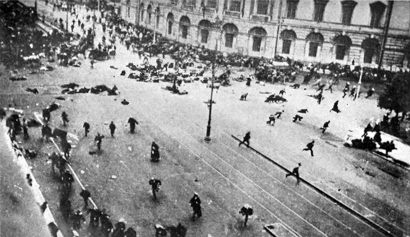 Участники уличной демонстрации разбегаются после того как Временное правительство применило против них пулеметы. Угол Садовой и Невского проспекта. Петроград, 4 июля 1917 г.