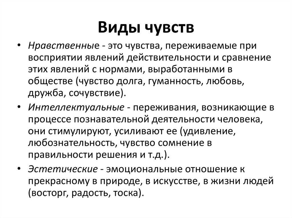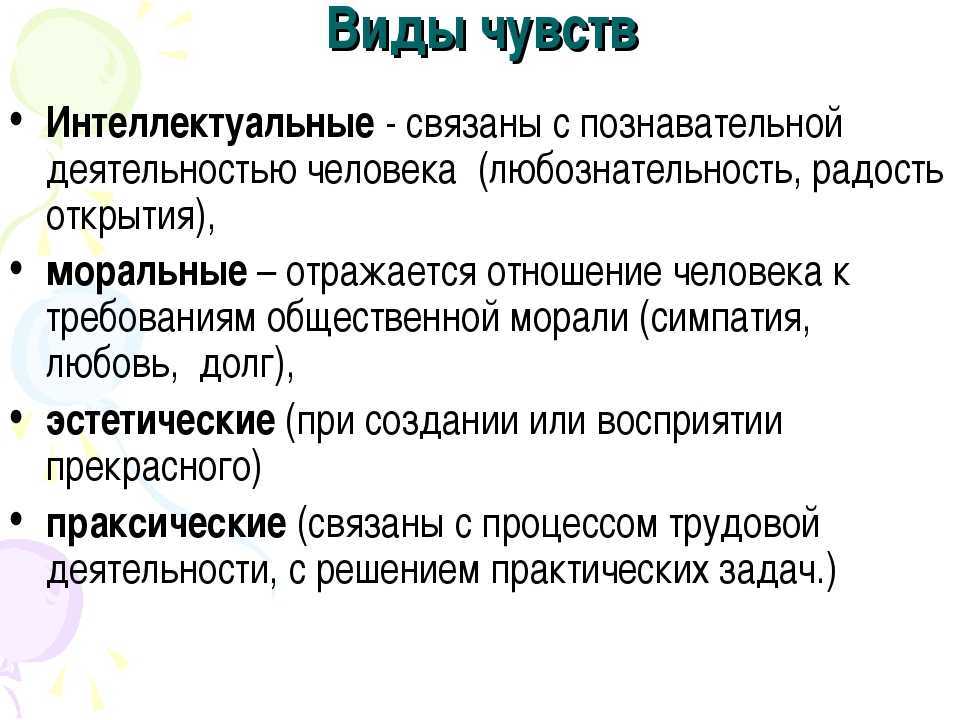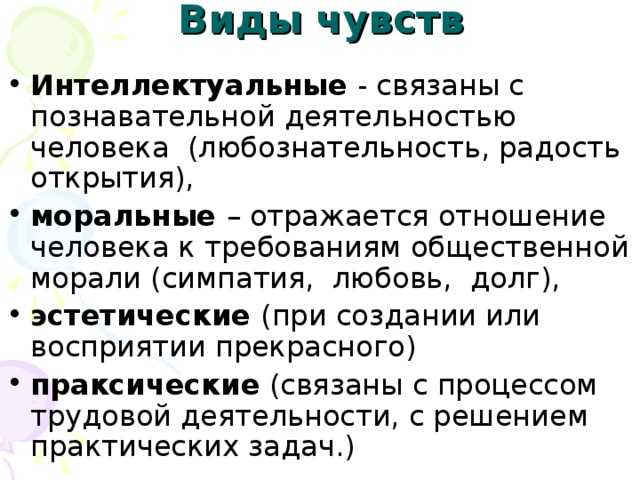 Основные виды высших чувств: моральные, праксические, интеллектуальные, эстетические.