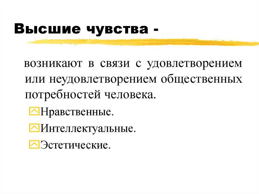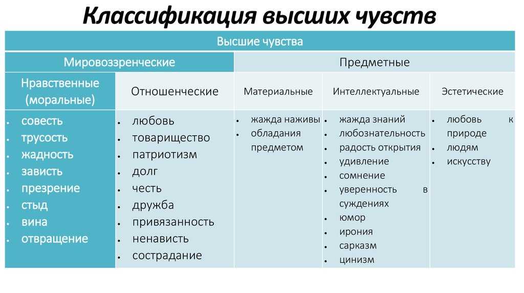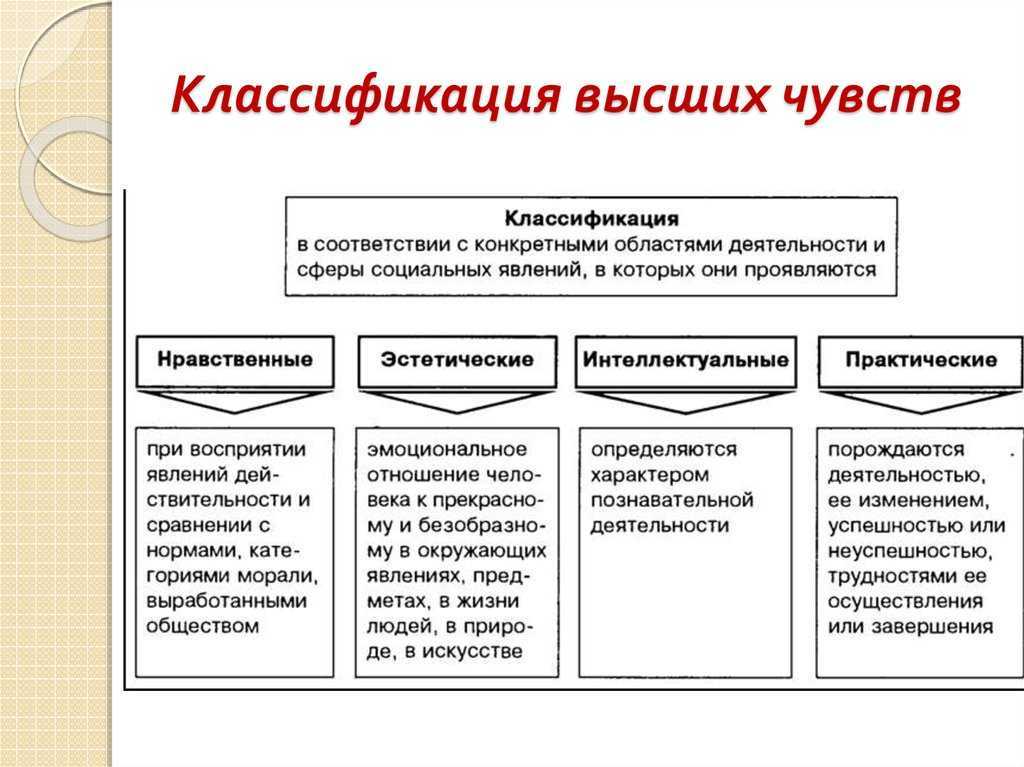 Высшие чувства человека представляют собой особую форму переживания, которая заключает в себе богатство истинных человеческих отношений. В зависимости от того к какой предметной среде они относятся их подразделяют на: