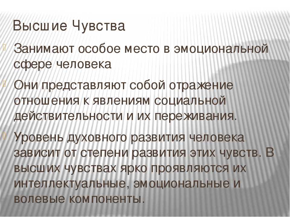 Чувства, которые отвечают высшим социальным потребностям, называются высшими чувствами. Например, любовь к Родине, своему народу, своему городу, к другим людям. Они характеризуются сложностью строения, большой силой, продолжительностью, стабильностью, независимостью от конкретных ситуаций и от состояния организма. Таким примером является любовь матери к своему ребенку, мама может рассердится на ребенка, быть недовольной его поведением, наказать, но все это не влияет на ее чувство, которое остается сильным и относительно стабильным.