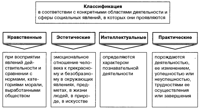 Они проявляются у людей по отношению друг к другу или по отношению к собственным действиям. Как правило, классификация чувств обусловлена сферой пребывания субъекта в обществе. Отсюда возникают следующие эмоциональные проявления: