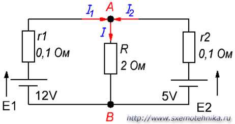 Итак, на рисунке 4 имеется сложная цепь с двумя источниками ЭДС величиной E1=12 в и E2=5 в , с внутренним сопротивлением источников r1=r2=0,1 Ом, работающих на общую нагрузку R = 2 Ома. Как же будут распределены токи в этой цепи, и какие они имеют значения, нам предстоит выяснить.