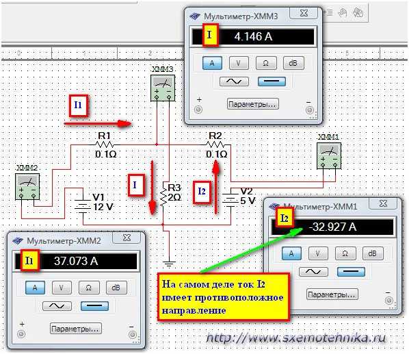 Знак «минус» для тока I2 означает, то что мы не правильно выбрали направление тока, то есть в нашем случае ток I2 вытекает из узла А.