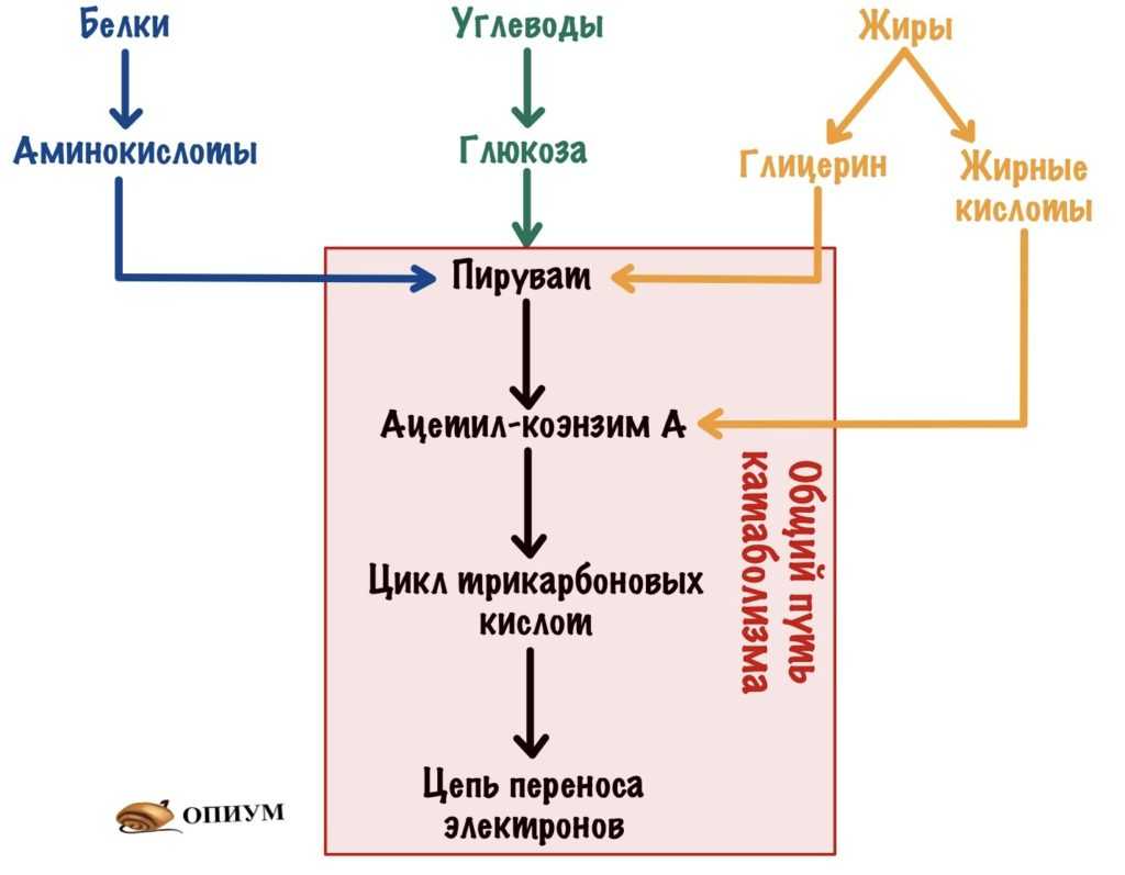 Общий путь катаболизма включает превращение пирувата в ацетил-коэнзим А, цикл трикарбоновых кислот и окислительное фосфорилирование. Видите? Он начинается с пирувата. Потому что: