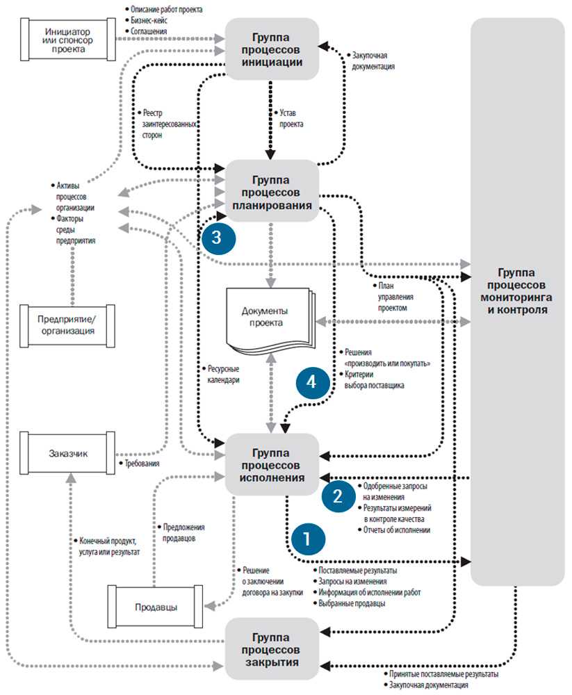 Рассмотрим еще один небольшой пример взаимодействия процессов управления проектом в ходе стадии непосредственного исполнения работ. Предположим, решая задачи, команда проекта столкнулась с рядом объективных причин, по которым накопились критические отклонения по срокам и некоторым бюджетным позициям. Возникла потребность внести изменения в консолидированный план. На выходе процессов организации исполнения возникает с подачи PM запрос на изменения (1), который отрабатывается на интеграционном уровне мероприятий контроля. Решение о принятии изменений возвращается в процессы исполнения (2). Затем изменения запускают процедуру перепланирования (3), и измененные планы поступают к команде с модифицированным составом задач, сроков и ресурсов (4).