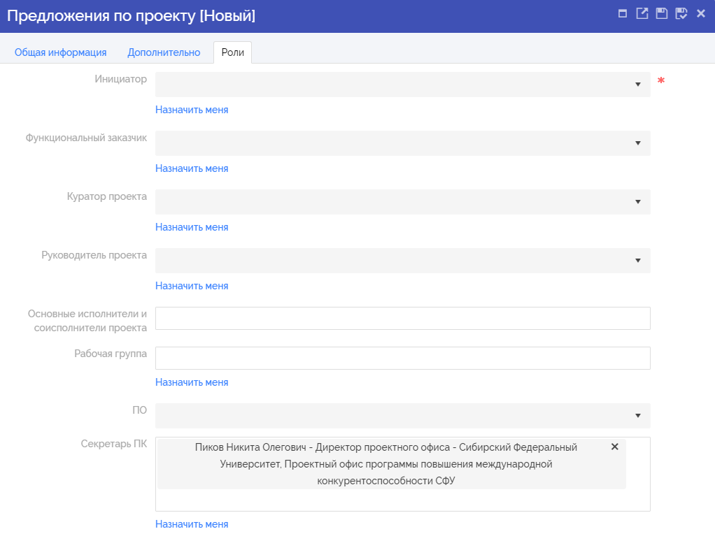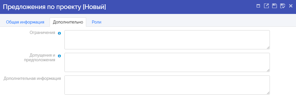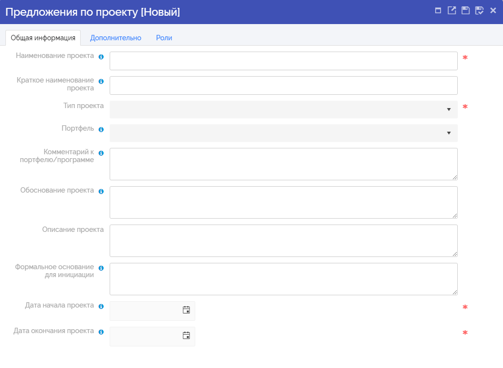 В открывшейся карточке редактирования (создания) предложения по проекту заполнить поля на вкладках «Общая информация», «Дополнительно», «Роли» и нажать «Сохранить». Данные сведения необходимы для принятия решения об инициировании проекта или программы. В случае положительного результата согласования на основании заполненной карточки предложения по проекту будет создан проект или программа.