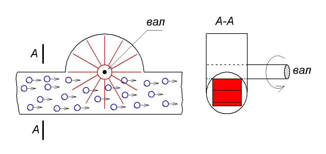 Имеем трубу, по которой бурным поток течет вода. К трубе приделана вертушка, типа водяного колеса. Лопасти вертушки крутят вал.