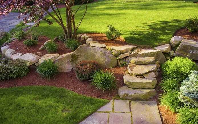 Больше всего подобный принцип зонирования подойдет участку с холмистым рельефом – там, где уже существуют естественные неровности. Углубив их либо слегка приподняв, можно не только разбить участок на зоны, но и создать оригинальные декоративные акценты, например: цветники, «болотные» клумбы, ступеньки, искусственный каскадный водоём.