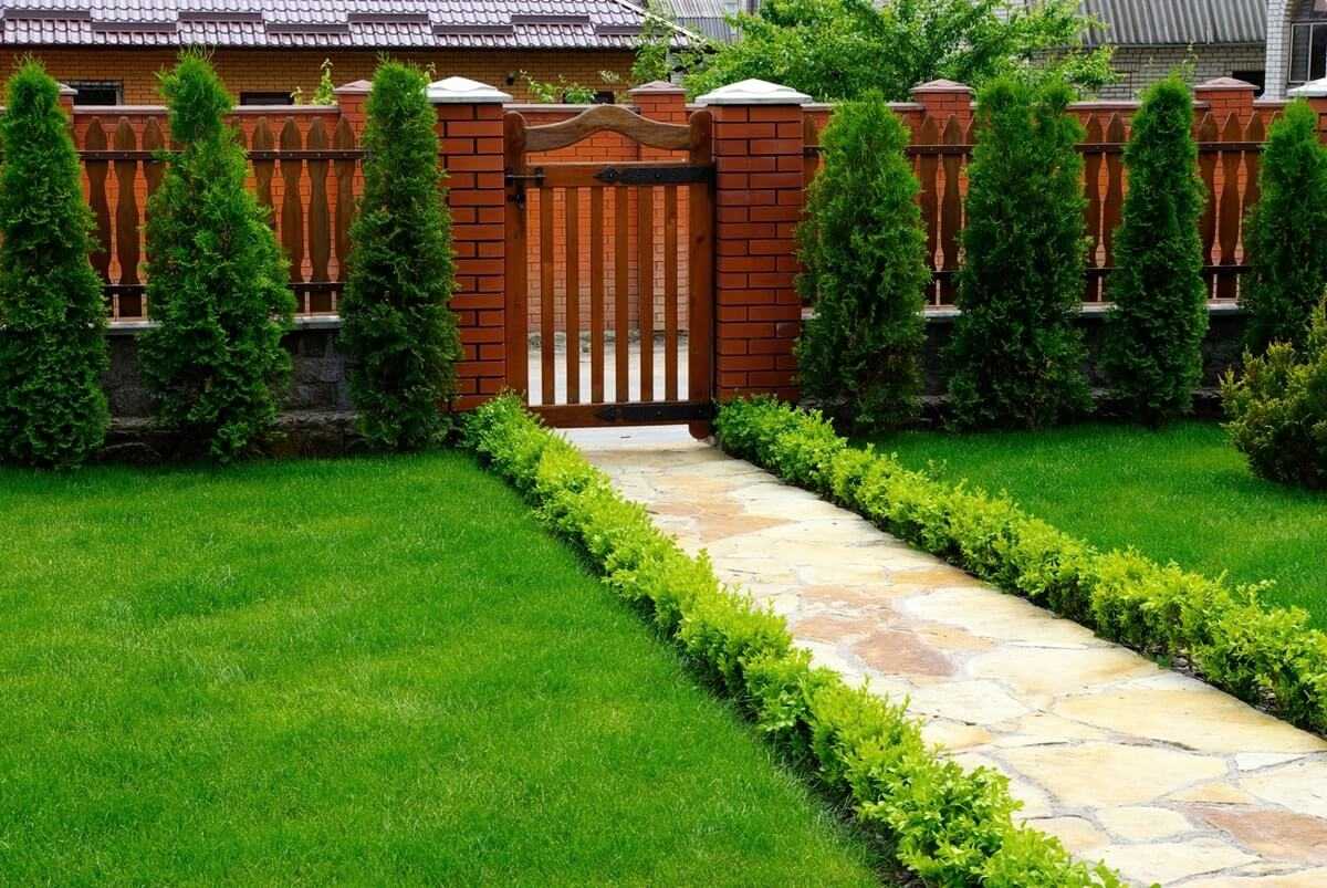 Калитку и дом соединяют мощёной, достаточно широкой аллеей, обрамляя её бордюрами из цветов или декоративных кустиков. Бывает, кусты высаживают и с внешней стороны участка, формируя из них невысокую изгородь