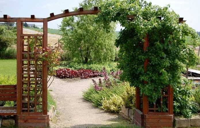 Подпоры, шпалеры и арки обсаживают многолетними, цветущими лианами, плющом, глицинией, вьющейся розой, клематисом, а также ползучими ягодными культурами – виноградом, актинидией, лимонником.