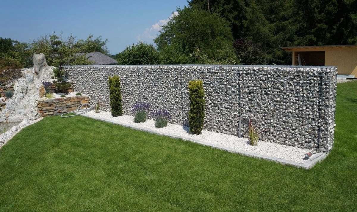 Коробы из проволочной сетки, наполненные небольшими камнями, – эффектное средство разграничения участка. К тому же зонирование при помощи подобных, модульных клеток, – довольно бюджетный способ.