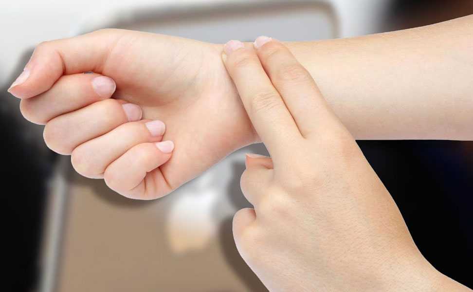 - Средний и указательный палец располагается на лучезапястном суставе. Необходимо нащупать артерию.