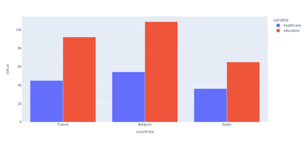 # по оси x разместим страны, по оси y — признаки px.bar(csect,x=’countries’,y=’healthcare’,’education’,barmode=’group’) |