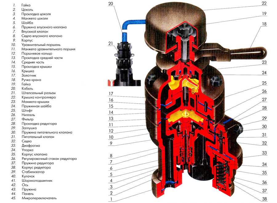 Уравнительный поршень своей хвостовой частью притирается с трубчатым клапаном, с его верхней частью, тем самым, выпускной канал закрывается. Открытие его происходит посредством впускной притирки, находящейся между втулкой и поясом трубчатого клапана, впрессованных в область нижней крановой части. Закрытие впускной притирки происходит за счёт пружинных усилий, в результате чего осуществляется непосредственное прижатие к втулке трубчатого клапана.