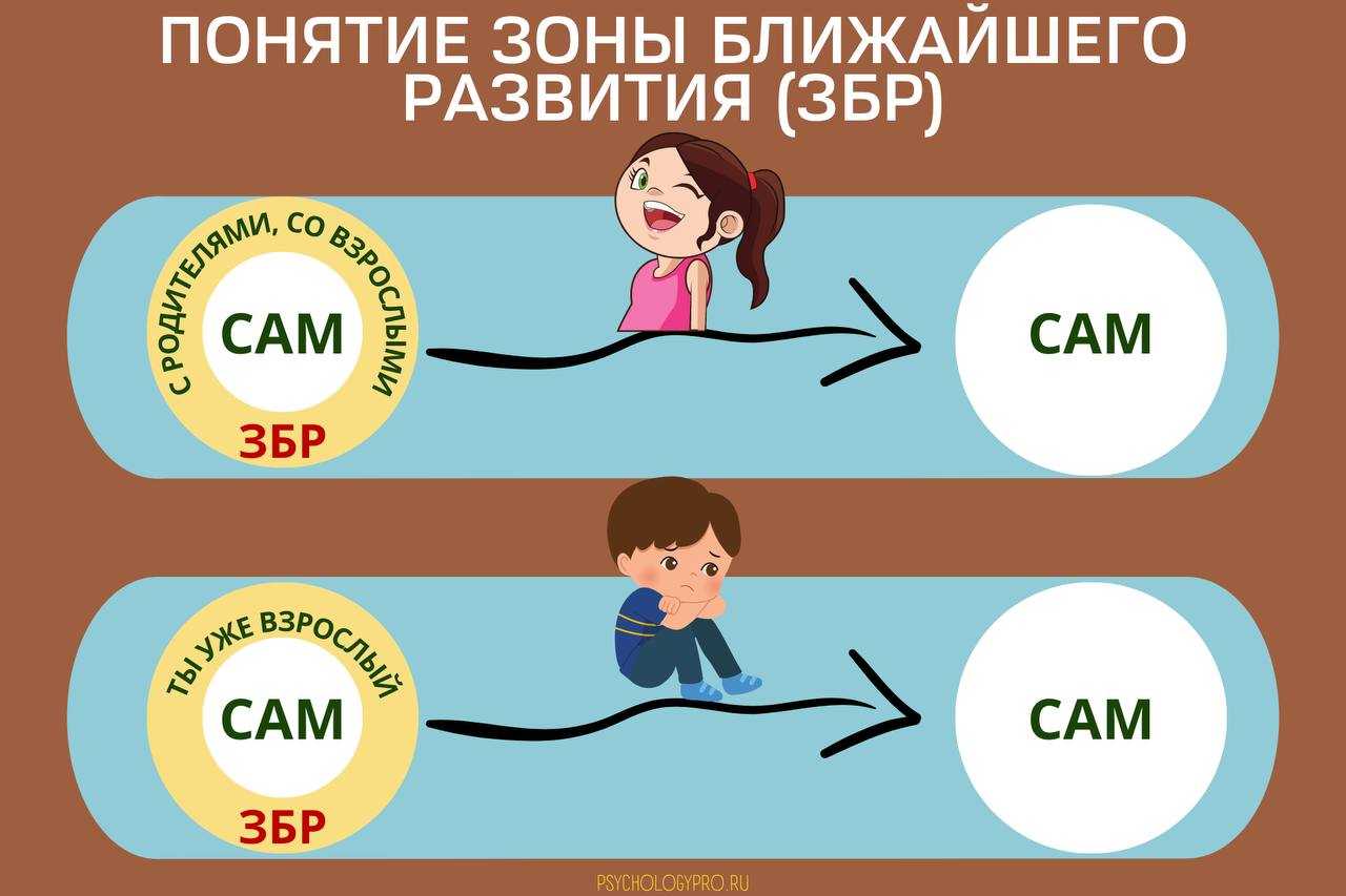 Таким образом, Выготский ввел в детскую психологию понятие «Зона ближайшего развития». В двух словах, это то, что ребенок уже в состоянии осознать и понять, но еще не может сделать полностью самостоятельно и нуждается в помощи взрослого. Например, ребенок понимает необходимость завязывать шнурки на ботинках, но не может завязать их сам, ребенок знает цифры, но пока не умеет их складывать и вычитать. Если в этот момент взрослые придут на помощь и покажут, как завязывать шнурки, расскажут, что такое сложение и вычитание, то очень скоро ребенок сможет справляться с этими задачами самостоятельно.