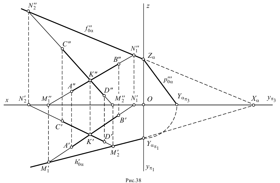 3. Через одноименные проекции следов проводим соответствующие следы плоскости (рис.38). Горизонтальный след плоскости проводим через горизонтальные проекции горизонтальных следов и . Фронтальный след проводим через фронтальные проекции фронтальных следов и .