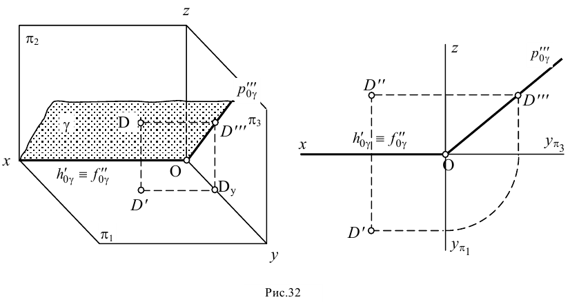 Осевой называют плоскость, проходящую через ось проекций. Осевая плоскость будет всегда перпендикулярна одной из плоскостей проекций, поэтому ее можно рассматривать как частный случай горизонтально-, фронтально- или профильно-проецирующей плоскости. У осевой плоскости два следа совпадают с одной из осей проекций (на рис.32 — с осью ).