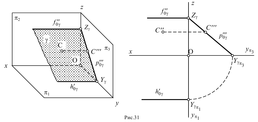 Профильно-проецирующей называют плоскость, перпендикулярную плоскости (рис.31). У такой плоскости фронтальный и горизонтальный следы будут параллельны оси .