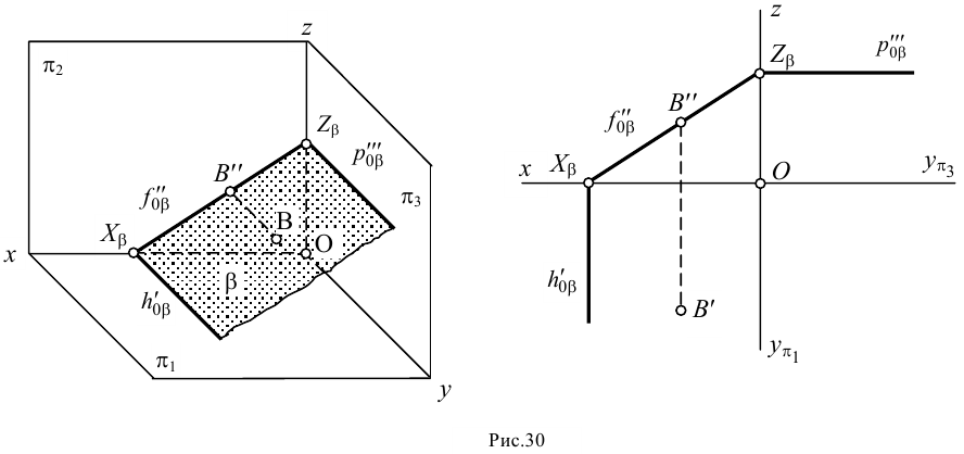 Фронтально-проецирующей называют плоскость, перпендикулярную плоскости (рис.30). Горизонтальный и профильный следы фронтально-проецирующей плоскости будут параллельны оси .