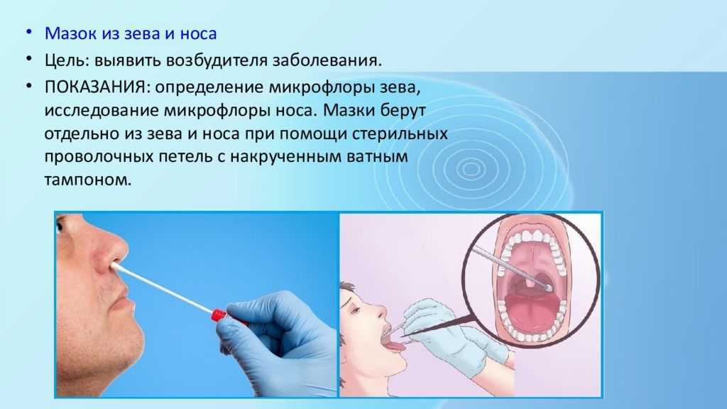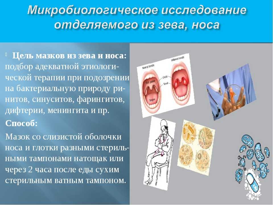 На слизистых одного человека насчитывается порядка 50 полезных микробов, сапрофитной и условно-патогенной флоры. Изучение слизи из носа и горла необходимо для определения состава и количеств микроорганизмов.