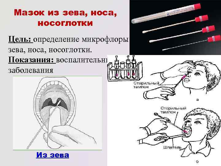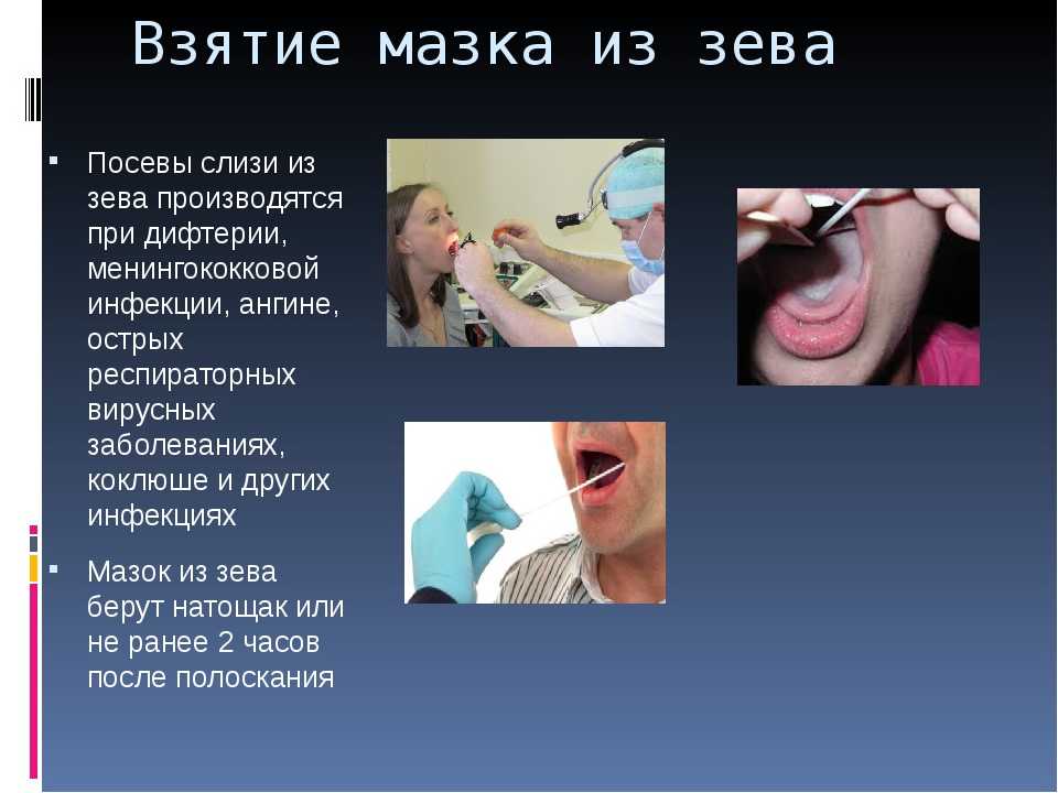 1) Взятие мазка из зева проводится натощак, до приема лекарств, до орошения полости рта дезраствора-ми, до назначения антибиотиков, до чистки зубов.
