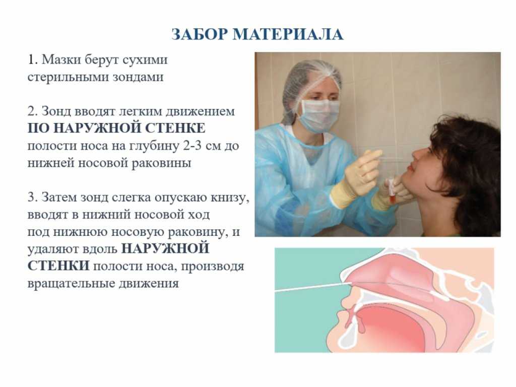 Мазок из носовой области берут после того, как пациент прочистит пазухи (высморкается), и особых требований к соблюдению режима перед анализом нет.