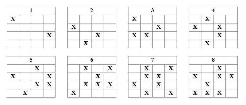 Методика «Крестики». Испытуемому дважды демонстрируются таблицы с различным распределением крестиков. После предъявления он должен занести крестики в свой бланк, как он их запомнил. На выполнение 1-4 карточки отводится по 10 секунд, 5-6 – 15 секунд, а для 7 и 8 – 20. Количество правильных ответов заносится в таблицу и интерпретируется в оценку в баллах.