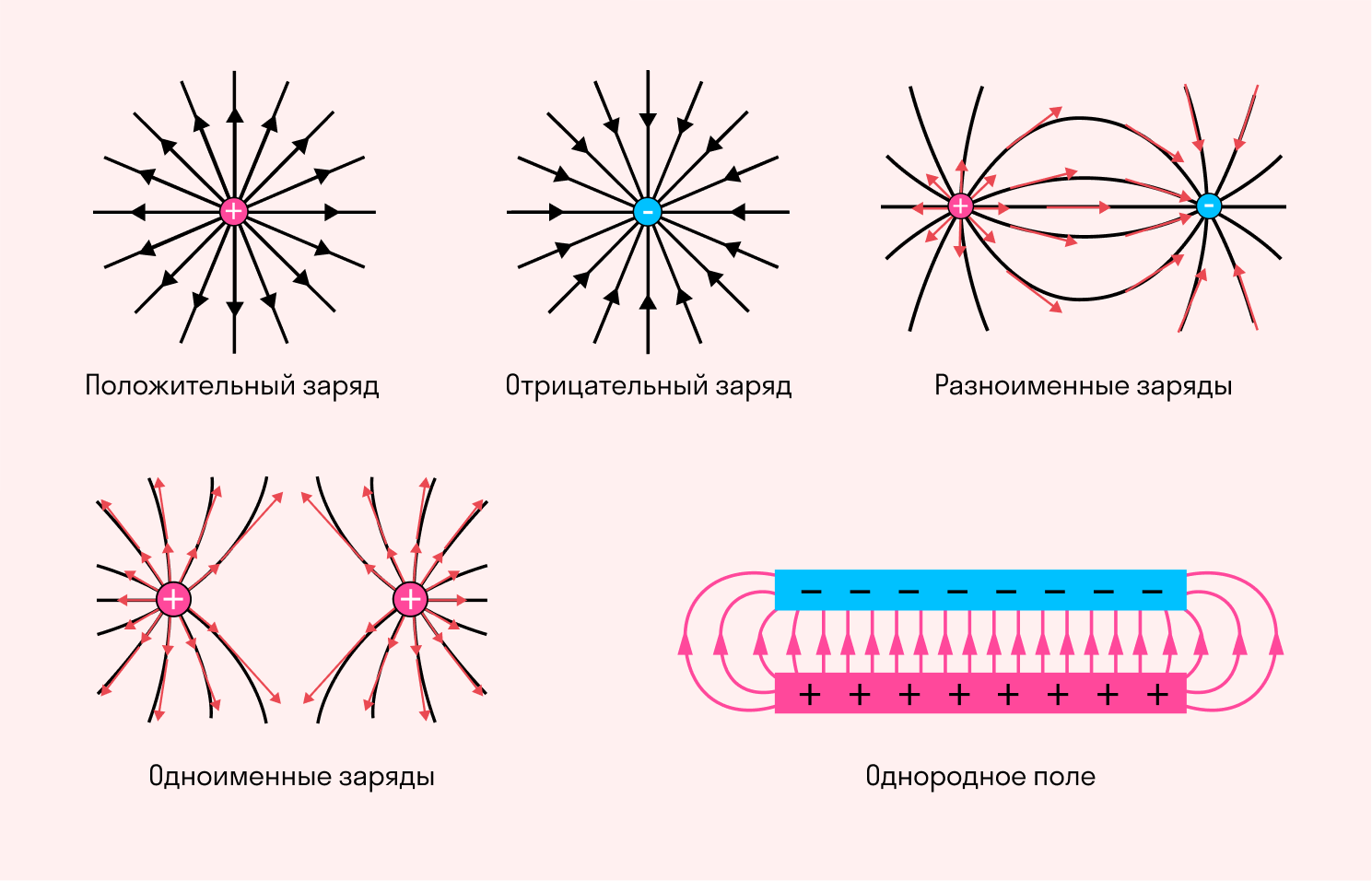 Электрическое поле нельзя увидеть невооруженным глазом, но можно изобразить с помощью линий напряженности. Графически это будут непрерывные прямые, которые связывают заряженные объекты. Условная точка начала такой прямой — на положительном заряде, а конечная точка — на отрицательном.