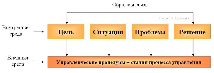 - обратная связь — осуществляет сравнение полученного результата от реализации решения с целью, ради достижения которой осуществлялся процесс управления.
