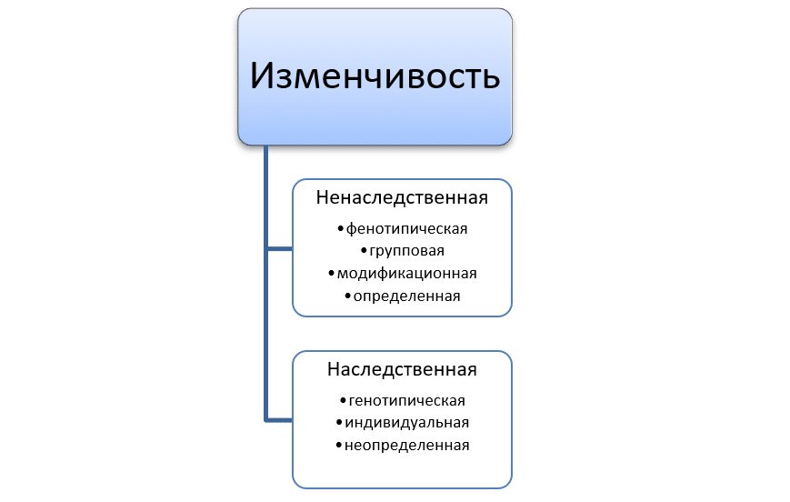Изменчивость бывает наследственной (генотипической) и ненаследственной (фенотипической).