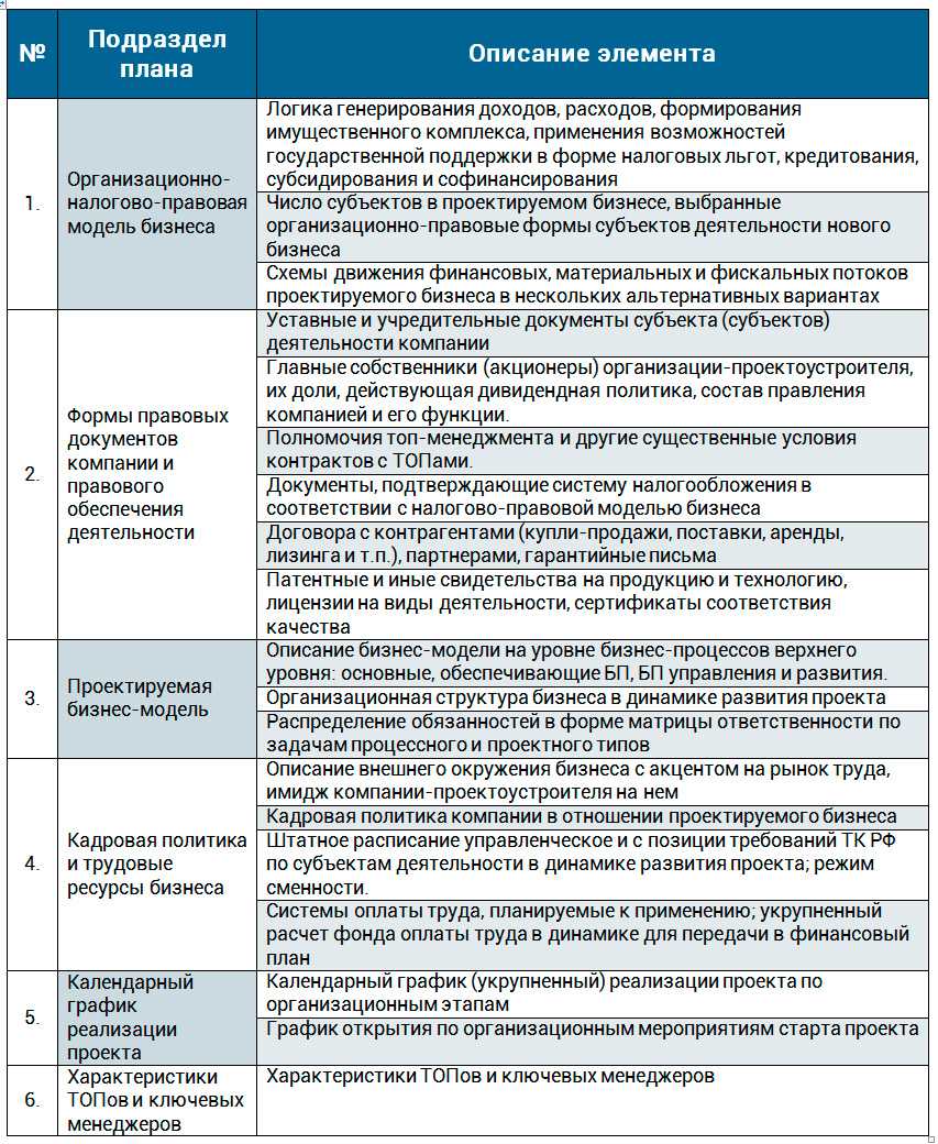 В целом нужно придерживаться общепринятых принципов международной практики, тем более, если инвестор высокого уровня. Но не надо забывать и о российских особенностях. Я не говорю сейчас про национальную забаву – «серые схемы», хотя и это присутствует, что греха таить. Каждый бизнесмен должен помнить, что входной билет на рынок включает организационно-налоговую модель, которая в условиях конкуренции позволяет выкроить 5, а то и 10% прибыли. Это общепринято, но не принято об этом говорить, хотя и значимо. С учетом сказанного я бы предложил следующую модель состава организационного раздела бизнес-плана применительно к среднему и малому бизнесу.