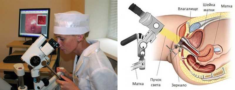 При подозрении на точечные образования, которые трудно оценить глазом, проводится осмотр под микроскопом шеечной зоны. Эта процедура, немного, дискомфортная. Но позволяет диагностировать опухоли на ранних стадиях.