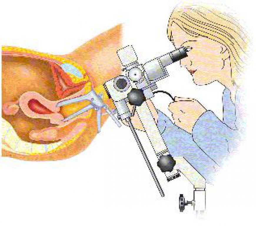 - Гинеколог вводит во влагалище женщины обыкновенный расширитель и зеркало, в 10-15 см от входа во влагалище устанавливается кольпоскоп.