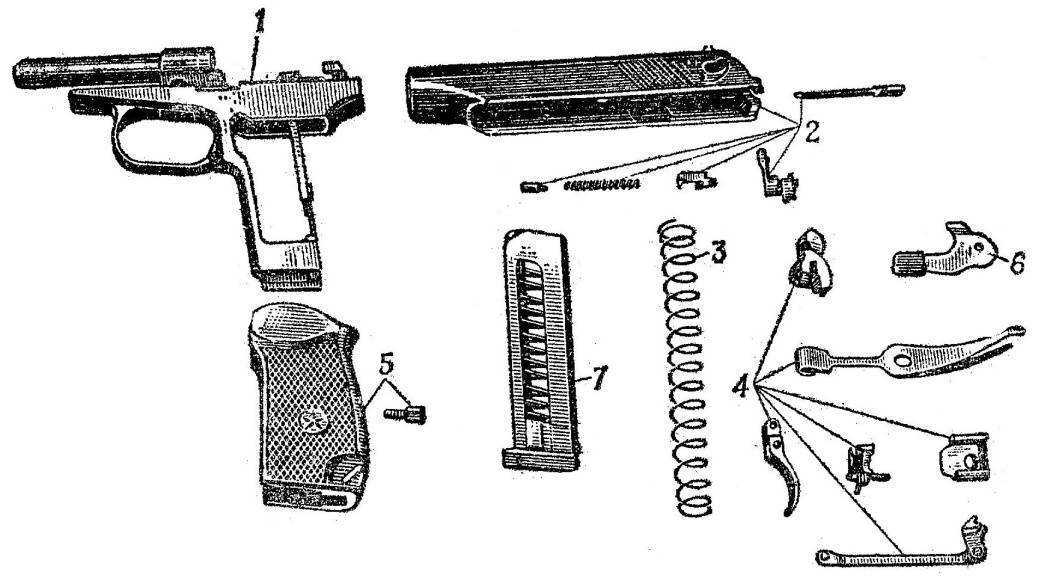 1 — Рамка со стволом и спусковой скобой; 2 — затвор с ударником, выбрасывателем и предохранителем; 3 — затворная задержка; 4 — части ударно спускового механизма; 5 — возвратная пружина; 6 — мгазин; 7 — рукоятка с винтом
