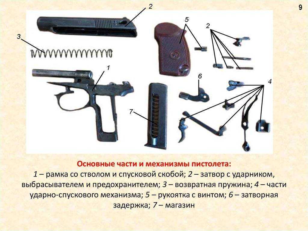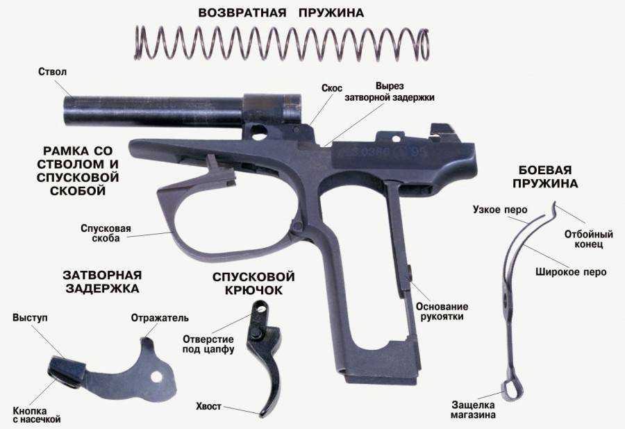 Пистолет состоит из 32 частей и включает в себя следующие основные части: